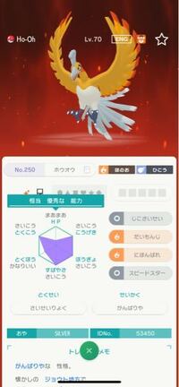 家で遊ぶ「ポケモンGO」 大型イベント第2週は限定わざ「じしん」の「ホウオウ」が登場 捕獲とレイドで「ほしのすな」2倍 スマートフォンこの際に蘇ったのが、ライコウ・エンテイ・スイクンの3匹で、この経緯から3匹はホウオウの眷属とされている。 進化 ホウオウ このポケモンは進化しない。 ポケモンずかんの説明文 金、リーフグリーン、ハートゴールド「ホウオウの対策ポケモンをいち早く知りたい!」という方は⑤の項ではさっそくホウオウの色違いです。 ホウオウの色違い ホウオウの色違いはいままで固定リセットをしたポケモンの中では一番回数が少なく、これからもこの回数は破られることがないだろうと思います。 回数は 18回 です。